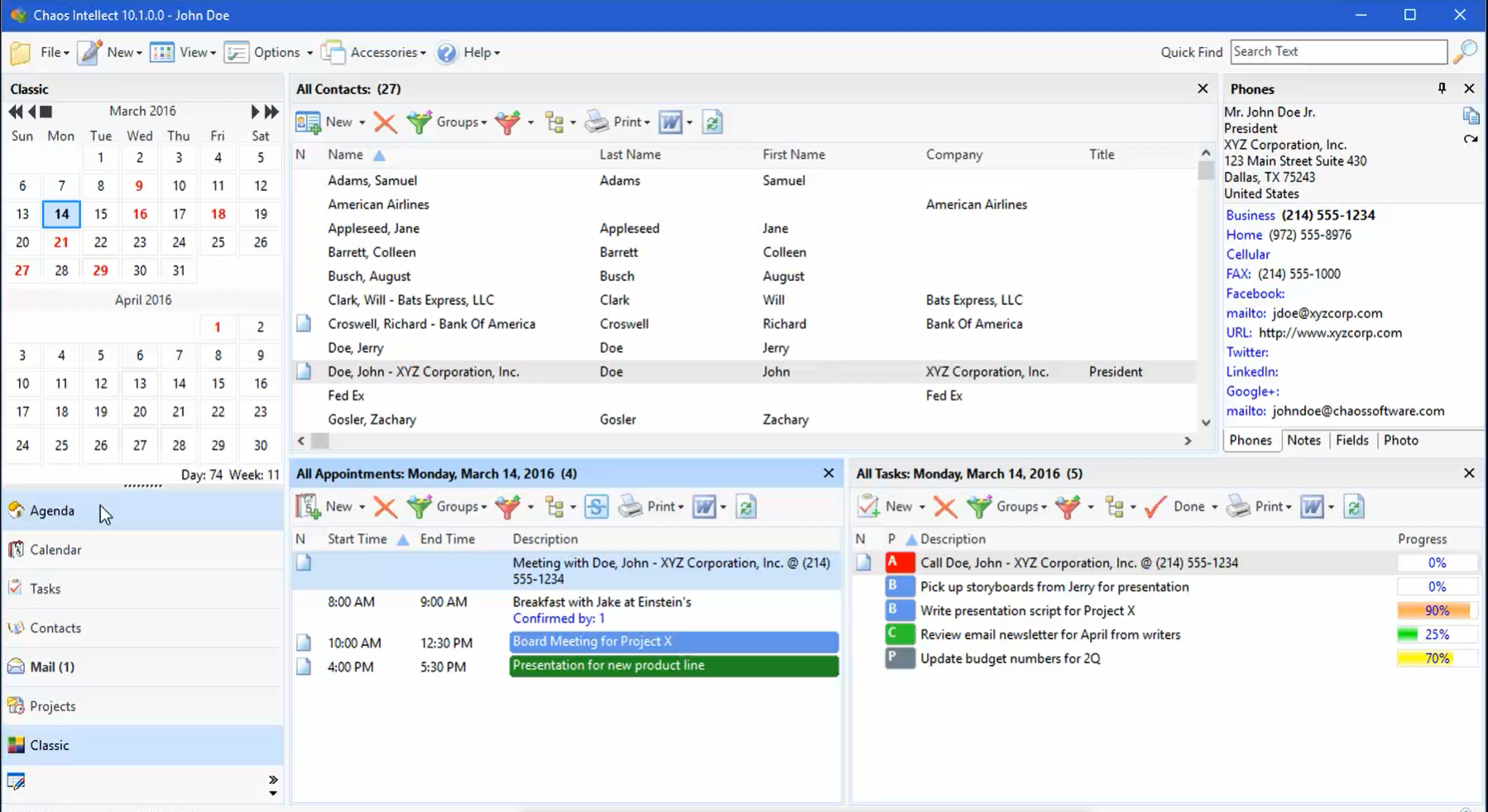 Chaos Intellect: Business email software and CRM contact management done right! If you haven't heard of Chaos Intellect before now, you've missed out! We have years of experience making great contact management CRM software, as featured in our award winning contact manager called Time & Chaos. Chaos Intellect combines this powerful contact manager experience with a great email client that hits the sweet spot for users like you! Why should you choose Chaos Intellect? We have two ways to answer that for you: on the left, you can view our features, organized by whether you are a Casual User, Business User or Advanced Power User. On the right, we let other users provide their own testimonials of how Intellect has worked for them. Keep reading for more details! Once you see enough to convince you to try it, keep in mind we have a fully-functional trial version you can download with no missing features and no hassles. We want you to see it work in the real world without any guessing!