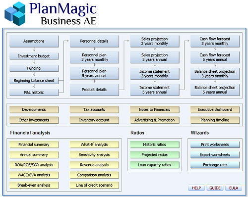 PlanMagic Business provides you with a full package to complete your business plan and project your financials. The Advanced Edition (AE) offers offers 2 investor pitches, executive dashboard, state-of-the-art analyses and scenarios as well as an interesting Web marketing guide.