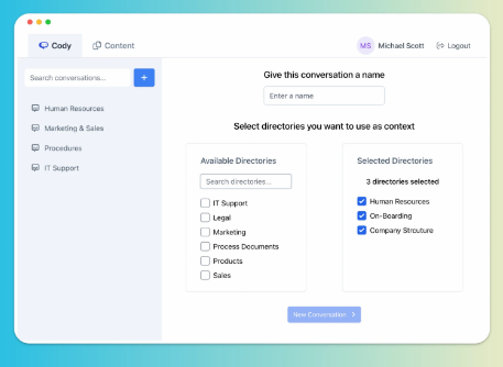Cody is an intelligent AI assistant like ChatGPT, with the added benefit of being able to train it on your business, your team, your processes, and your clients with your own knowledge base. Use Cody to support your team, answer questions, help with creative work, troubleshoot issues, and brainstorm ideas. No need to track down manuals or sift through endless documents. Cody analyzes all accumulated documents and acts as an expert on all your company processes to provide the answer you need in seconds. Securely upload anything from PowerPoints to PDFs to instantly integrate information and customize Cody for your company. Cody will search the database you provide and use it to craft an intelligent answer. For added peace of mind, you can check Cody’s work. Whether it’s from one source or multiple sources, Cody provides the sources used to come up with every answer. Use Cody to complete tasks faster, write professional emails, translate documents, or create marketing materials.
