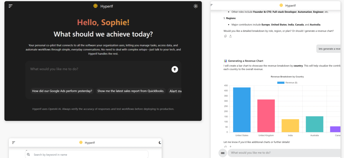 Hyperif is an API-native, conversational AI assistant that connects across your software stack so you can ask natural language questions, get insights, and have the system take actions for you, all without building workflows or automation logic. It lets you chat to pull data, analyze that data, generate summaries, and even execute commands. Conversations can be turned into reusable agents that you can re-run, essentially converting chat into automation without traditional setup. Hyperif emphasizes security and privacy: it uses OAuth for integrations, only accesses data when you request it, doesn’t retain user data or conversations by default, and offers enterprise options for private hosting and persistent memory. The system supports context awareness (so follow-ups make sense), and bridges insight and action.