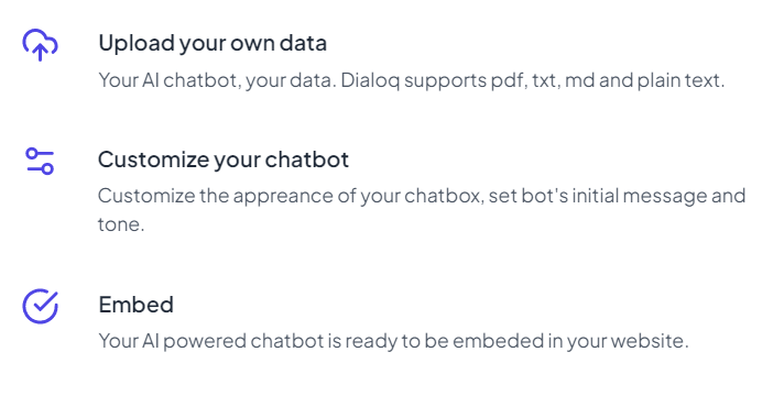Setting up AI powered chatbot in Dialoq is easy and requires zero coding knowledge. Customize the appreance of your chatbox, set bot's initial message and tone. Your AI powered chatbot is ready to be embeded in your website. Dialoq uses a message credit system to calculate the number of messages your chatbot can send each month. Each time your chatbot sends a message, one credit is deducted from your account. Character credit is the total limit of characters that can be uploaded in your data, and it is shared among the chatbots you have created. Once you have trained your chatbot, you can embed the chatbot by using iframe or Javascript. You can select chat box theme, set its default message and bot's personality