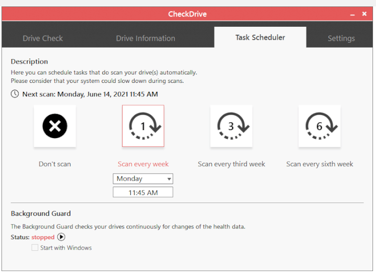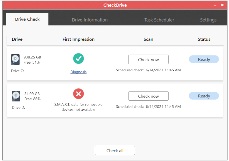 CheckDrive offers you an easy way of checking your PCs hard drives for errors. Those errors can be fixed immediately if you like. CheckDrive shows info about your drives and determines if your hard drive needs to be cleaned or fragmented. The CheckDrive Background Guard constantly monitors the values of your hard drives and alerts you immediately if an error occurs. So you know immediately if something is wrong. This application has been already optimized for Windows 10. You don't have to care which Windows operating system you have installed. Hard disks are the brain of computers, no one can afford to have them suddenly fail. So a security system should be installed urgently. The free Windows software CheckDrive specifically searches for hard disk errors so that they can be fixed before any real problems occur. The Abelssoft program is capable of analyzing hard drives of all kinds. CheckDrive can handle hard drives over 1 TB in size, external USB drives, or super-fast SSD drives.