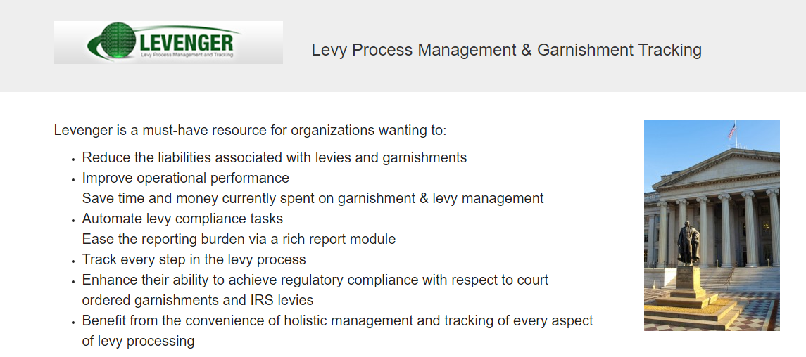 Levenger solves the problems associated with levy management and handles every aspect of the levy process from the tracking and printing of response letters to the generation of Official Checks and GL entries. Whether your team is centralized or diverse, Levenger is your enterprise solution. Levenger accommodates multiple state transactions via consolidation of all 50 states into one central location. Levenger accomplishes this by providing configuration options for Levy Case Types and Levy Bodies unique to the state issuing the Levy. Levenger Processes payments through an integrated payments module designed to produce any required MICR encoded document type including official checks and general ledger tickets. Once a levied amount is marked for payment, the official check is ready for printing complete with logo, digitized signature, and MICR information. Document security and audit reports are maintained throughout the payment processes.