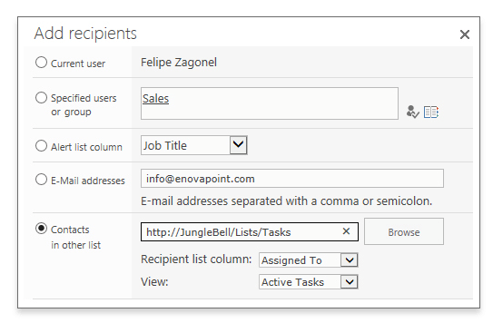 Send reminders, extend alerts and notifications, and customize templates. No web parts, workflows, or coding are involved. JungleBell comes with Past by or Approaching in criteria. Sending automatic reminders on project deadlines, overdue tasks, upcoming meetings, contracts or policy expiration has never been so easy. JungleBell user-friendly interface allows SharePoint users to intuitively set up customized email alerts with only a few clicks, and without using any coding or workflows. Build condition groups by simply selecting the desired list columns, the related actions and the final value. Use multiple conditions at once to filter the alert results. The possibilities are limitless. Set up alerts to be triggered when SharePoint items are created, modified, and deleted. It’s even possible to configure alerts on changes in specific SharePoint column values.