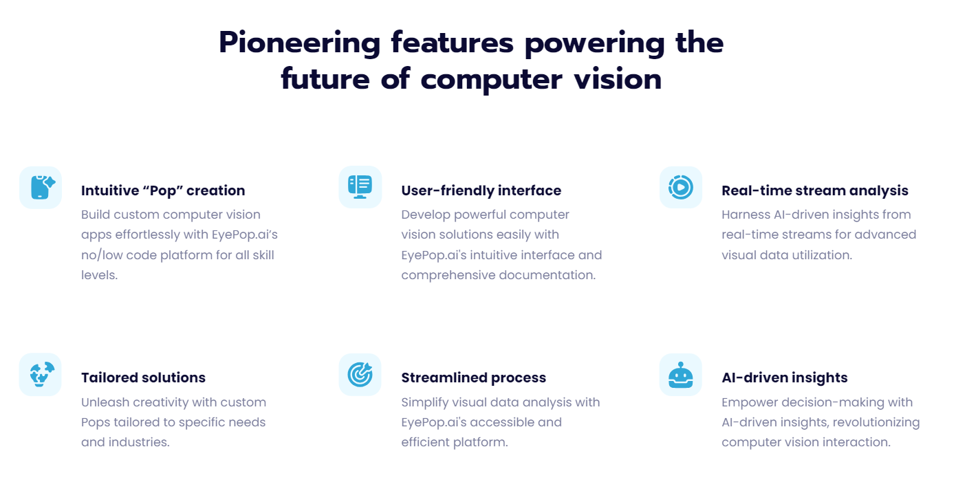 Streamlining visual data analysis for easy, accessible AI-powered insights, regardless of industry or technical knowledge. Build your tailored AI application with EyePop. Embark on your project journey today, leveraging our advanced computer vision technology. Discover the untapped potential in your images and videos. Our platform delivers deep insights into your media, enhancing user experiences and boosting engagement. Building a custom application is a breeze with our intuitive no/low code platform. Anyone can easily create Pops that work with existing images, videos, or even real-time streams. Develop powerful, tailored computer vision solutions and make the most of your visual data. Empower decision-making with AI-driven insights, revolutionizing computer vision interaction. Build custom computer vision apps effortlessly with EyePop.ai’s no/low code platform for all skill levels.