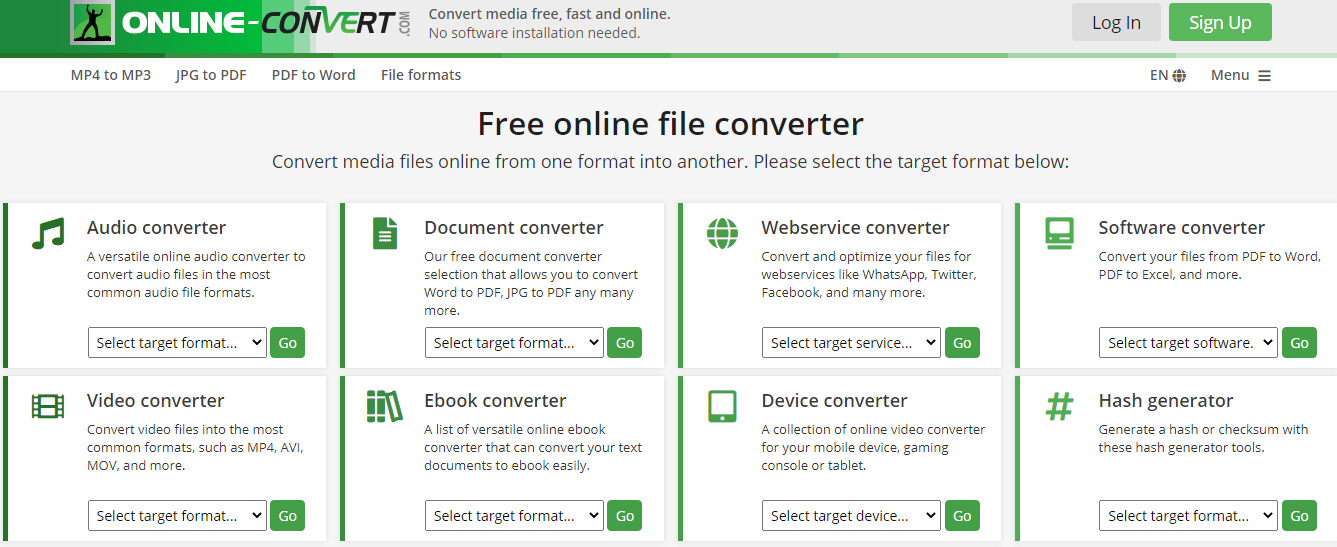 Convert media files online from one format into another. A versatile online audio converter to convert audio files in the most common audio file formats. Our free document converter selection that allows you to convert Word to PDF, JPG to PDF any many more. Convert and optimize your files for webservices like WhatsApp, Twitter, Facebook, and many more. Convert your files from PDF to Word, PDF to Excel, and more. Convert video files into the most common formats, such as MP4, AVI, MOV, and more. A list of versatile online ebook converter that can convert your text documents to ebook easily. A collection of online video converter for your mobile device, gaming console or tablet. Generate a hash or checksum with these hash generator tools. Create archive files like a ZIP with this free compression tool. This free online file converter lets you convert media easy and fast from one format to another.