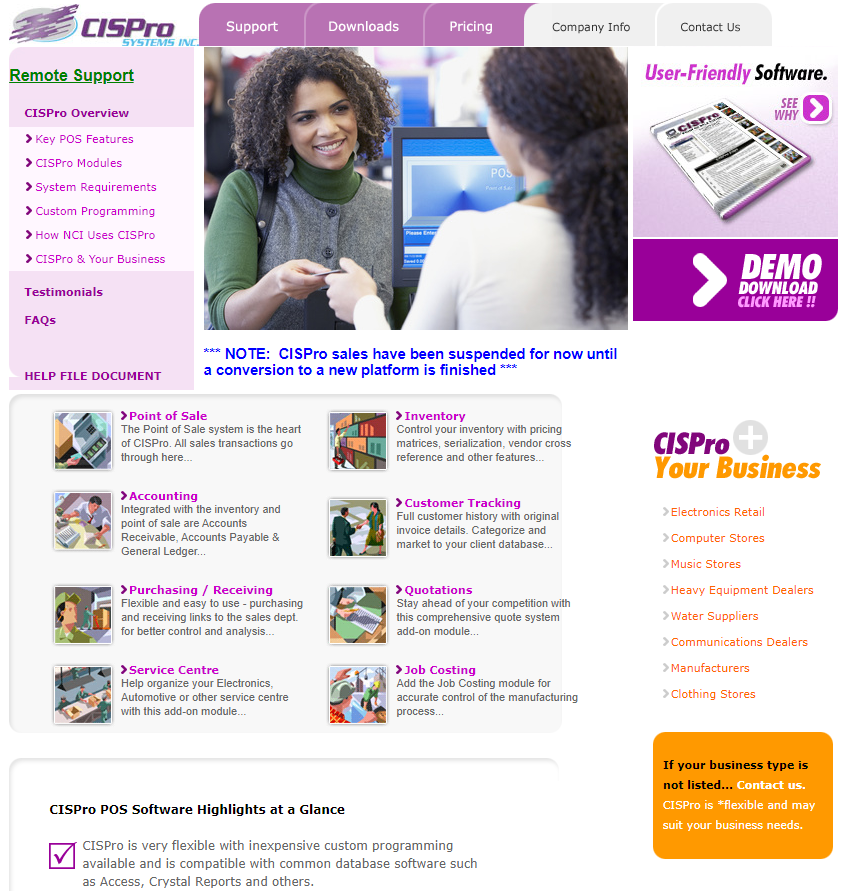 CISPro is very flexible with inexpensive custom programming available and is compatible with common database software such as Access, Crystal Reports and others. Works with many major brands of Point of Sale hardware including cash drawers, barcode scanners, pole displays and receipt printers. Runs on a standard Windows computer and is very easy to learn and use. Training Videos and unlimited phone support helps you implement CISPro quickly and painlessly. The Point of Sale system is the heart of CISPro. Control your inventory with pricing matrices, serialization, vendor cross reference and other features. Run two Point of Sale (or Quotes or other) screens at once. You can be working on a Sales Order in the background and do a quick cash sale in another window. You can transfer Quotation information between an old quote and new.