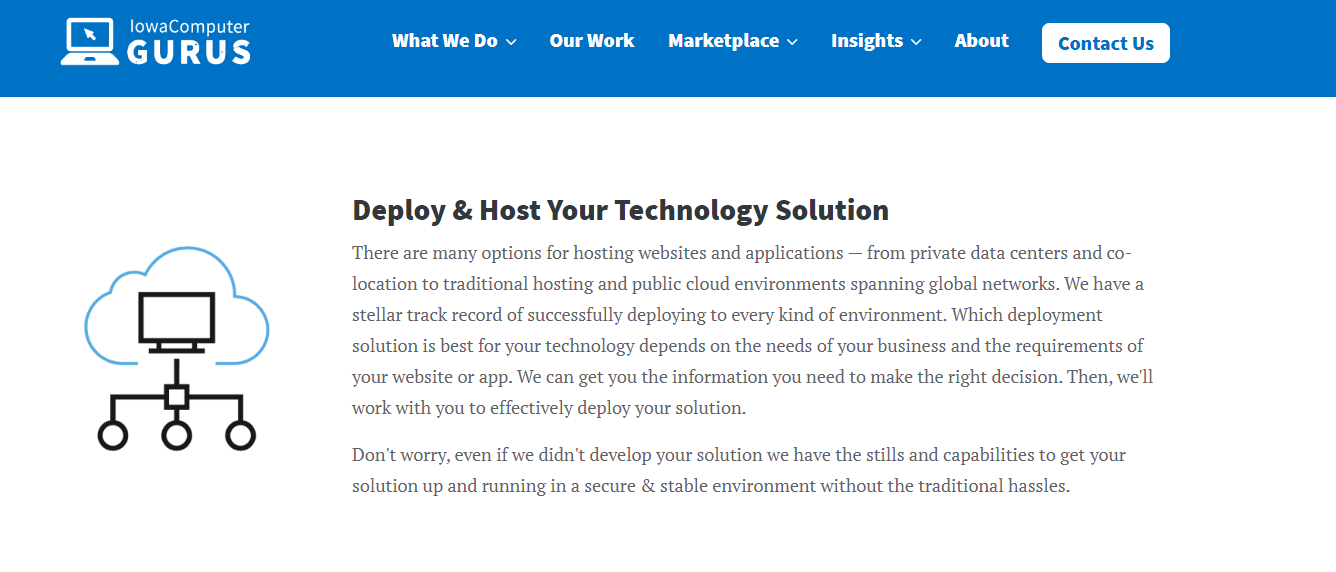 We understand that an elegant website solution and a well-executed application are not complete until they are deployed into a live, production environment and delivering value. We have worked hand-in-hand with all of the leading hosting and cloud providers to ensure that every deployment solution performs at its best — from simple hosted small business solutions to mission-critical and geo-redundant installation serving global enterprise brands. There are many options for hosting websites and applications — from private data centers and co-location to traditional hosting and public cloud environments spanning global networks. We have a stellar track record of successfully deploying to every kind of environment.