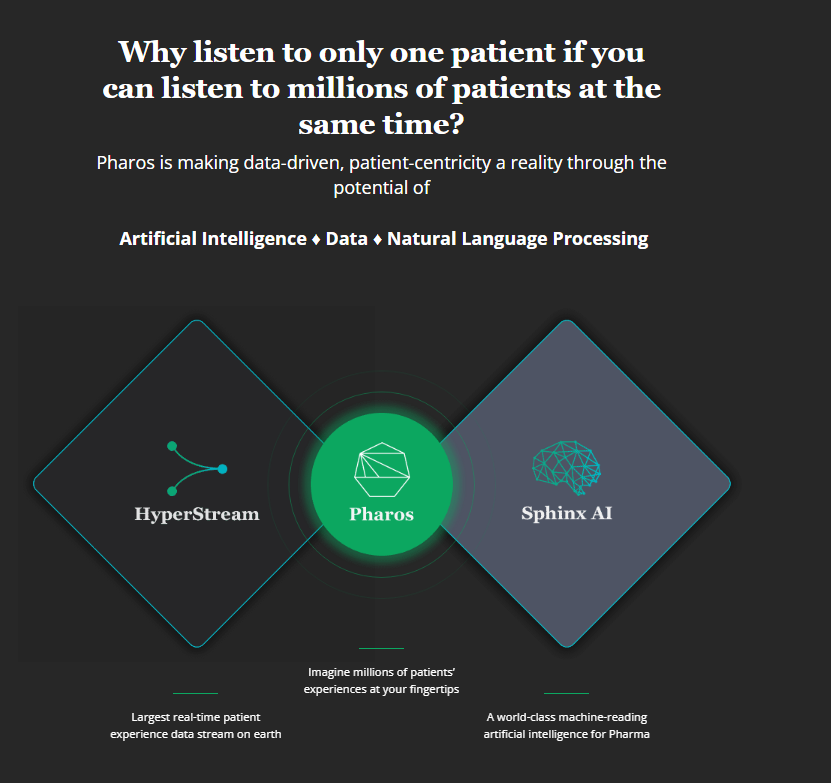 The cost, complexity and long timeframes associated with evidence generation through traditional approaches prevent agile research and the broader utilization of authentic patient insights in the treatment development and commercial pipelines. Our HyperStream represents the largest real-time patient experience data stream on earth. It captures the real-world digital history of diseases, as they are shared by authentic patients online. Pharos is a web-based evidence generation tool and research framework that uses its integrated data streaming and AI capabilities to efficiently capture online patient experience data and enables teams to quickly discover evidence when they need it. To date, the Pharos Suite has successfully been used to generate evidence and patient insights in multiple therapy areas and diseases.