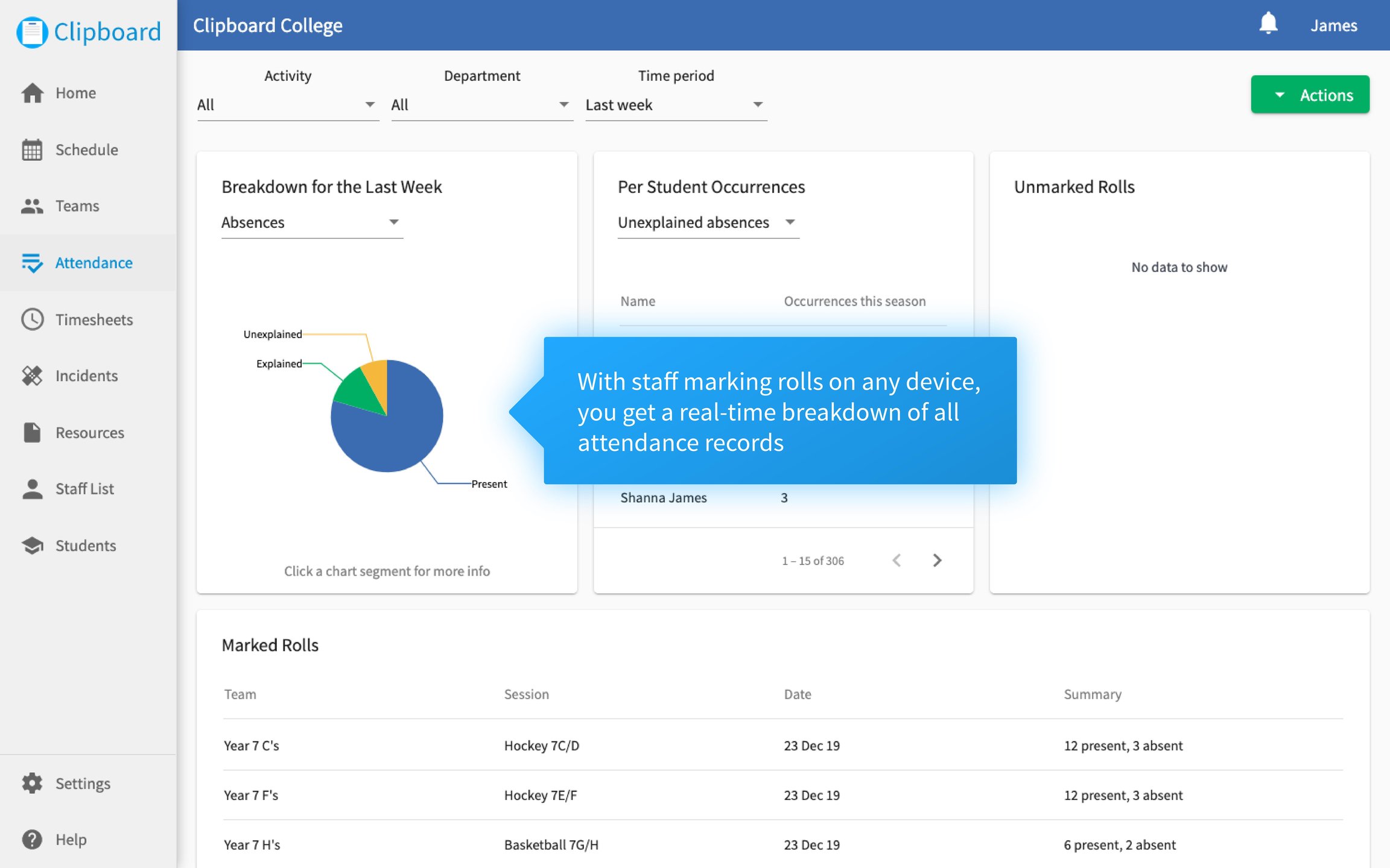 Track all extracurricular attendance in one place and quickly pull the reports that you need. Updates are happening faster than ever before, highlighting the need for instant and personalised communication with your school’s community. Clipboard is an Extracurricular Management System (EMS). An EMS is a purpose-built platform designed to help schools manage the administration of their extracurricular activities. It is a one-stop-shop for extracurricular data and processes, allowing schools to access reporting and analytics that they would otherwise be unable to utilise. Send session details straight to your staff and instantly share any changes. Staff can keep track of their sessions from any device, so everyone’s always on the same page. Clipboard automatically notifies staff of changes to sessions they're assigned to, so they're always kept up to date with where they need to be.