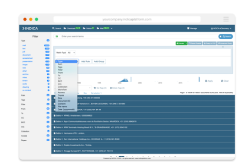One platform, four solutions. INDICA connects to all company applications and data sources. It indexes all live data and gives you grip on your complete data landscape. With its platform as a basis, INDICA offers four solutions. Enterprise Search. INDICA Enterprise Search enables access to all the corporate data sources through one interface. It indexes all structured and unstructured data and ranks the results to relevance. INDICA eDiscovery can be set up as a case by case platform and as a platform that will allow you to run fraud or compliance investigations on the fly. The INDICA Privacy Suite provides you with an extensive toolkit to allow your organization to comply to GDPR and CCPA laws and to remain compliant. INDICA Data Lifecycle Management allows you to take control of your corporate data, keep track of your data and clean or migrate your data. INDICA’s data platform consists of a broad set of features to get in control of your data.