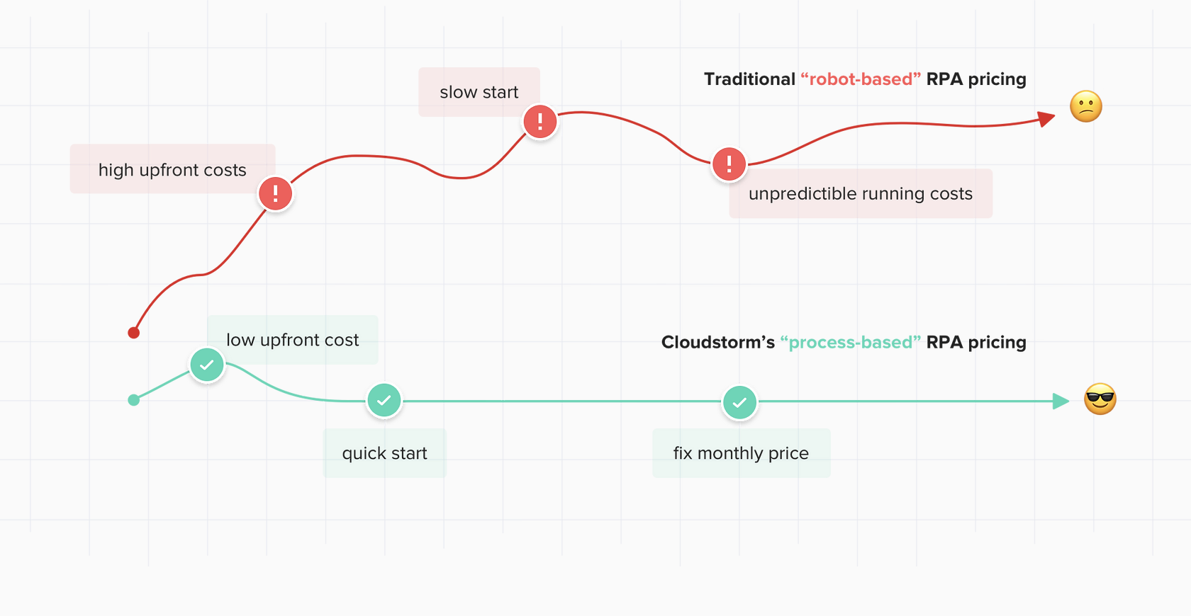 Meet Nika, our qualitative process discovery tool that helps you to automatically collect, assess & document the best automation ideas from employees. End-to-end RPA service (from process design to development, execution, & maintenance) all for a fixed monthly price, starting from €500 per month. Our on-demand, certified, EU-based RPA developers can help your company in planning & building your own RPA CoE, running RPA PoCs, implementing RPA process, RPA maintenance, RPA migration & more! With our end-to-end RPA service, you won’t need to hire RPA developers anymore or create an RPA Center of Excellence (CoE). RPA becomes a simple and predictable monthly fee for your organization. Compared with the traditional, "robot-based" RPA pricing our "process-based" pricing allows you to start with RPA faster and for a lower cost. As we use our own RPA technology, you don’t pay license fees, just a flat monthly price per process!