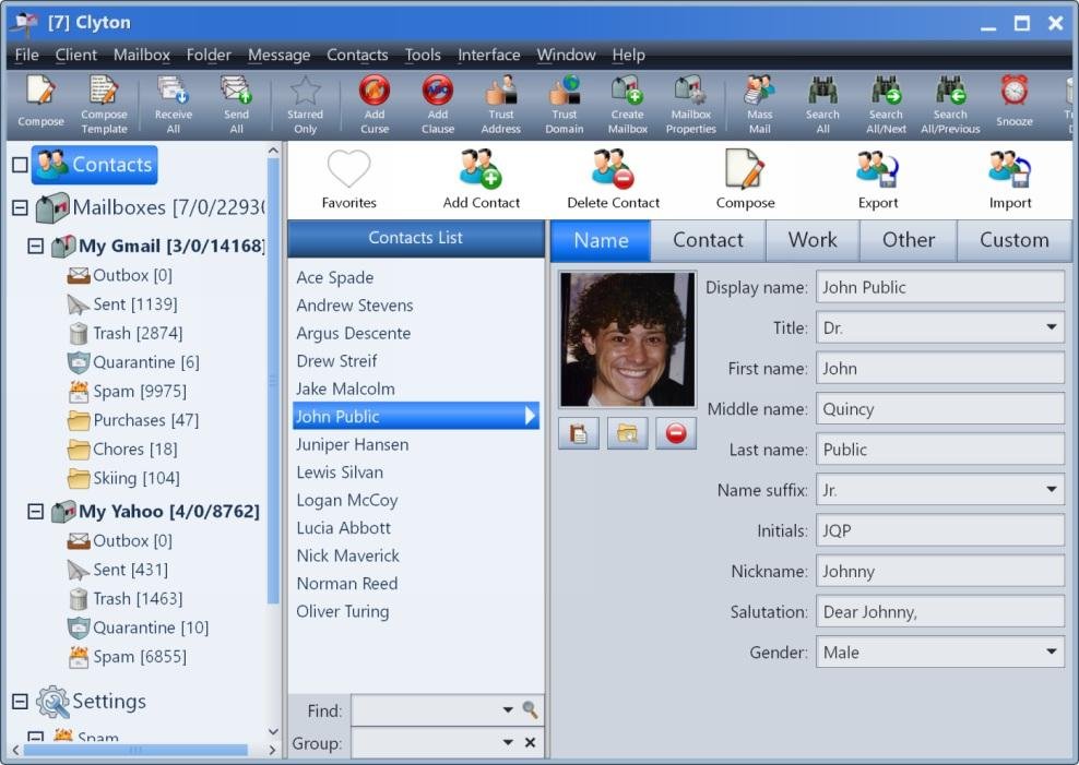 Clyton is an email client with advanced security and spam filtering features. The spam filter is highly configurable and supports DNS blacklist checking (DNSBL). Expect 85% of spam to be eliminated with the default configuration. Email that is suspicious but not obviously spam is quarantined for 24 hours and then retested, providing the blacklist enough time to react to new spam sources. The built-in address book supports personalized mass-mailings. Received email cannot run scripts, download multimedia, or use embedded objects without your approval. Other features include encrypted storage, whitelisting, powerful HTML editor, attachment viewer, message drag and drop, custom message templates, SSL encryption, USB flash drive installation, and much more.
