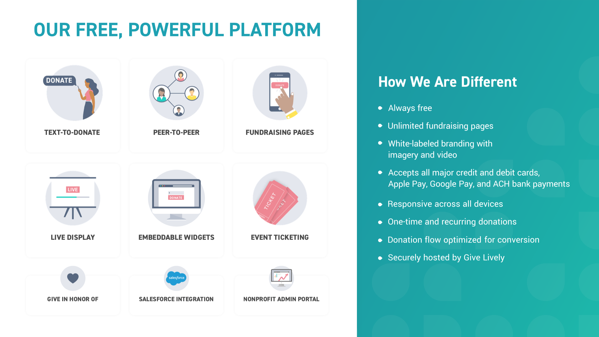 Give Lively is a tech company reimagining the future of nonprofit fundraising. Founded in 2015 on the belief that nonprofits, no matter their size, should not sacrifice their means to satisfy their missions, we build powerful and practical fundraising solutions that are free for nonprofits and intuitive for donors. Our dedicated team collaborates directly with nonprofits to develop tools that serve their needs and disburden them of for-profit fundraising software. Our free mobile-ready tech includes online appeals, event- and peer-based campaigns, donation by text, paying via digit wallets and much more. Nonprofits using Give Lively have raised more than $400 million for their critical work. Free nonprofit membership is required.