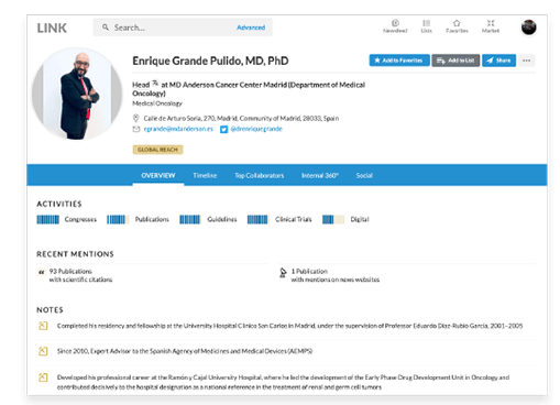 Veeva Link delivers real-time customer intelligence to enable relevant engagement with key people. Identify and prioritize key people and foster informed, high value interactions. Drive alignment across field teams, channels, and geographies. Keep a pulse of your scientific platform and competitive activity to tailor your strategies. Provides real-time customer intelligence on key people in 12 different therapeutic areas. Leverage Link's global presence to identify current and emerging leaders, experts, and influencers and gain a more nuanced understanding of the therapeutic area ecosystem. Activities, tweets, research findings, and collaborations are aggregated in real-time in one place. Enabled by advanced technologies and validated by 1,000+ data curators, Veeva Link ensures data accuracy and coverage. Enables commercial agility and operational efficiency through data and platform integration.