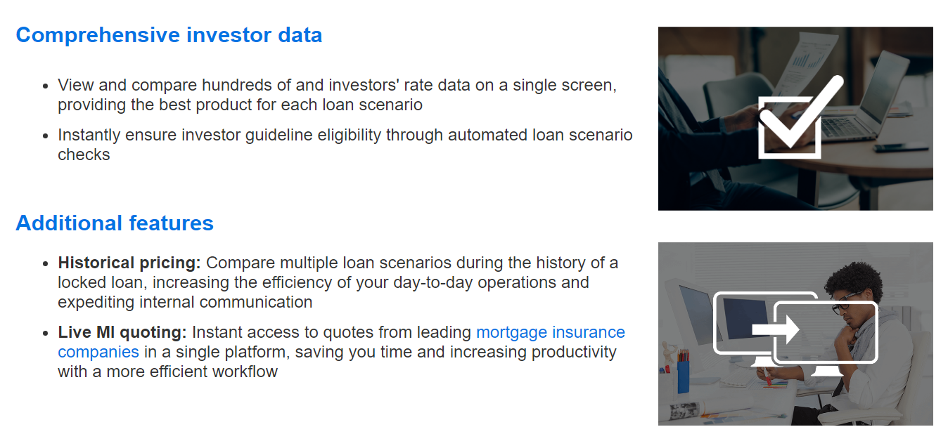 Leverage mortgage pricing engine tools, product eligibility data, and investor pricing to bring a more automated and streamlined workflow into your day-to-day processes. Automate and streamline your secondary desk, increase the efficiency of your daily operations, and expedite internal communications with features such as historical pricing and LOS integrations. Grow your business and market reach by pushing your live mortgage offers to the industry's top online marketplaces. Build out a targeted purchase strategy now, to better align yourself to be the first lender to reach out to these home sellers in need of new home financing. Leverage Mortech APIs to push your product and pricing strategy-specific rates live to proprietary websites, point-of-sale solutions, smart applications and more. With our simple onboarding process we can have this integration implemented into your business model in as little as two weeks.