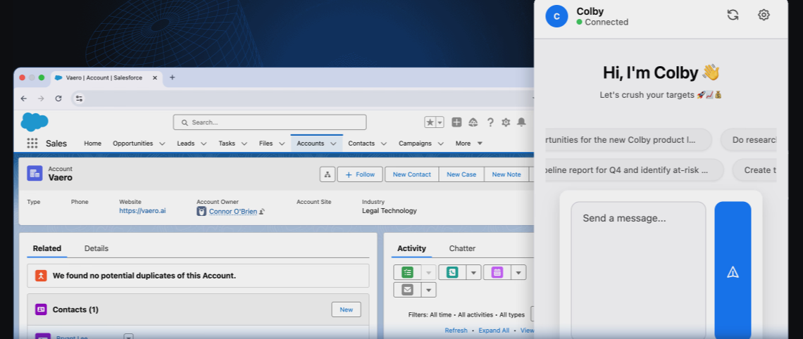 Colby is an AI-driven sales assistant embedded as a Chrome extension that automates Salesforce data management through natural language and voice commands. It researches prospects online, enriches lead records, enters and updates contacts, logs meeting notes, adds reminders, and performs bulk data corrections within Salesforce in under a minute, up to 120× faster than traditional report-and-Excel workflows. Designed for seamless integration, Colby requires no installation beyond a browser add-on and no training, automatically understanding your Salesforce context and web-sourced data to populate opportunities and client profiles with in-line citations. Its built-in AI models deliver real-time market research, reconcile conflicting information, and update records at scale, while session-based data deletion ensures user privacy. Regular model updates guarantee continuous improvement with no extra setup.