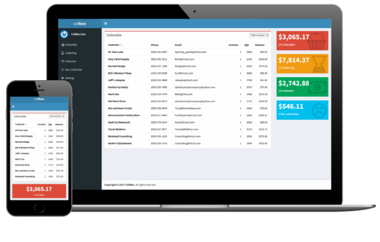 Improve your collection process with CollBox. Getting paid what you’re owed can be a painful, time-consuming, and inefficient process. The CollBox platform simplifies the process of getting paid by connecting to your existing cloud accounting software, identifying past-due accounts, and instantly pairing them with the best provider for the job, whether that’s a gentle Receivables Specialist or a vetted Collection Agency. CollBox analyzes your accounts receivable to identify slow-pay and no-pay customers. Simply select the past-due accounts you want help with and we’ll take it from there. Behind the scenes, CollBox manages a network of reputable, vetted receivables agents and collection agencies. Your specific debt is matched with the provider who has been proven to be effective within your industry. CollBox seamlessly integrates with cloud accounting systems so you can get started immediately.