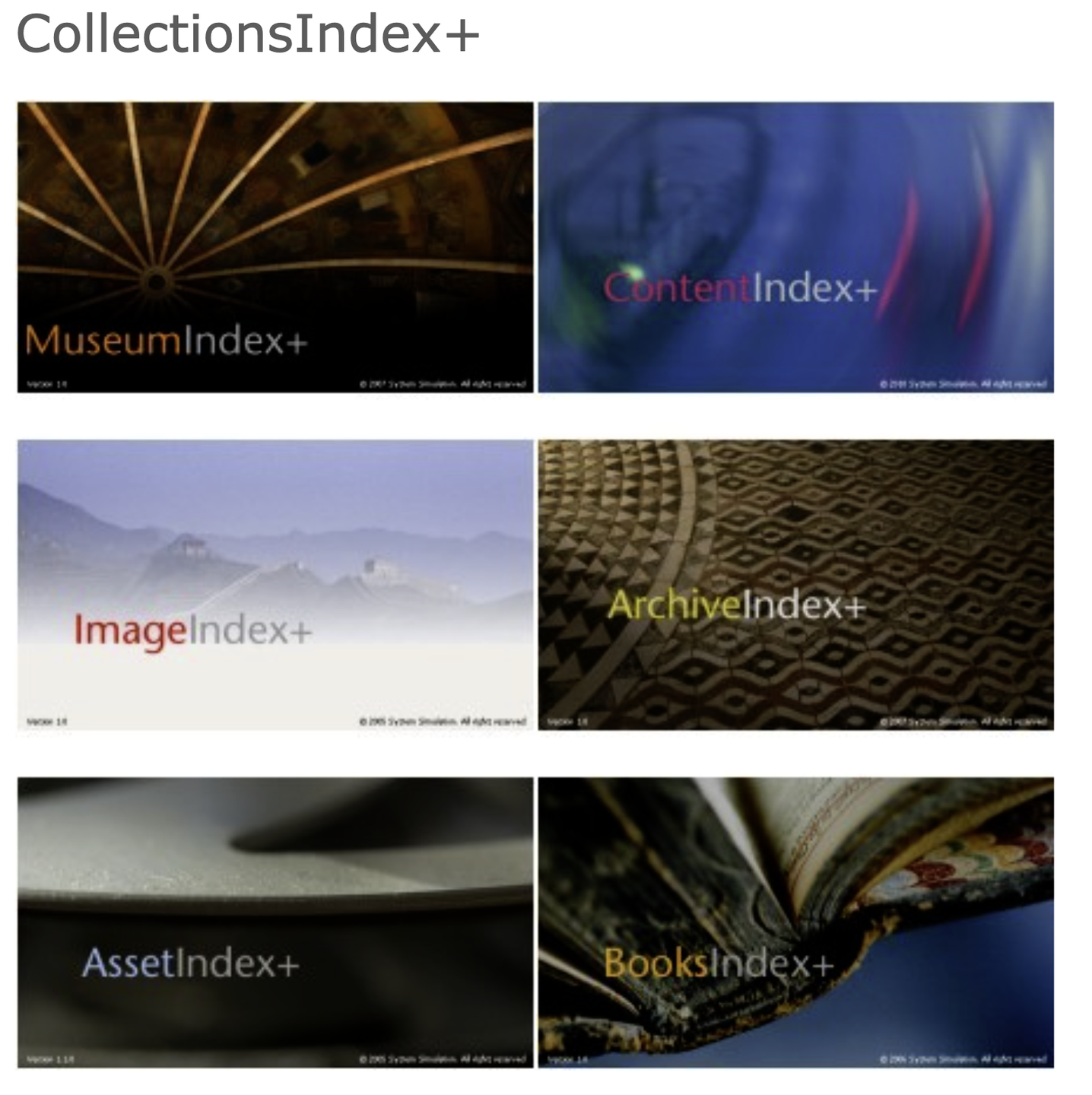 CollectionsIndex+ is a modular software system for collections and content management, handling your objects, archives, books, images, video, digital assets, and web and gallery content. System Simulation provides a whole range of collections management products covering books, archives and museum objects: BooksIndex+, ArchiveIndex+, and useumIndex+. We also provide enterprise-strength products for digital image and digital asset management: ImageIndex+ and AssetIndex+. Although all of these products are often deployed individually, they are also fully compatible and can be deployed as a powerful suite of integrated modules that complement each other.
