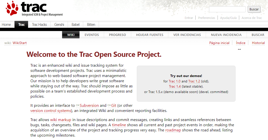 Trac is an enhanced wiki and issue tracking system for software development projects. Trac uses a minimalistic approach to web-based software project management. Our mission is to help developers write great software while staying out of the way. Trac should impose as little as possible on a team's established development process and policies. Trac allows wiki markup in issue descriptions and commit messages, creating links and seamless references between bugs, tasks, changesets, files and wiki pages. A timeline shows all current and past project events in order, making the acquisition of an overview of the project and tracking progress very easy. The roadmap shows the road ahead, listing the upcoming milestones. Trac has a built-in wiki system which you can use for organizing knowledge and information in a very flexible way by creating pages containing an intuitive and easy to learn textual markup.