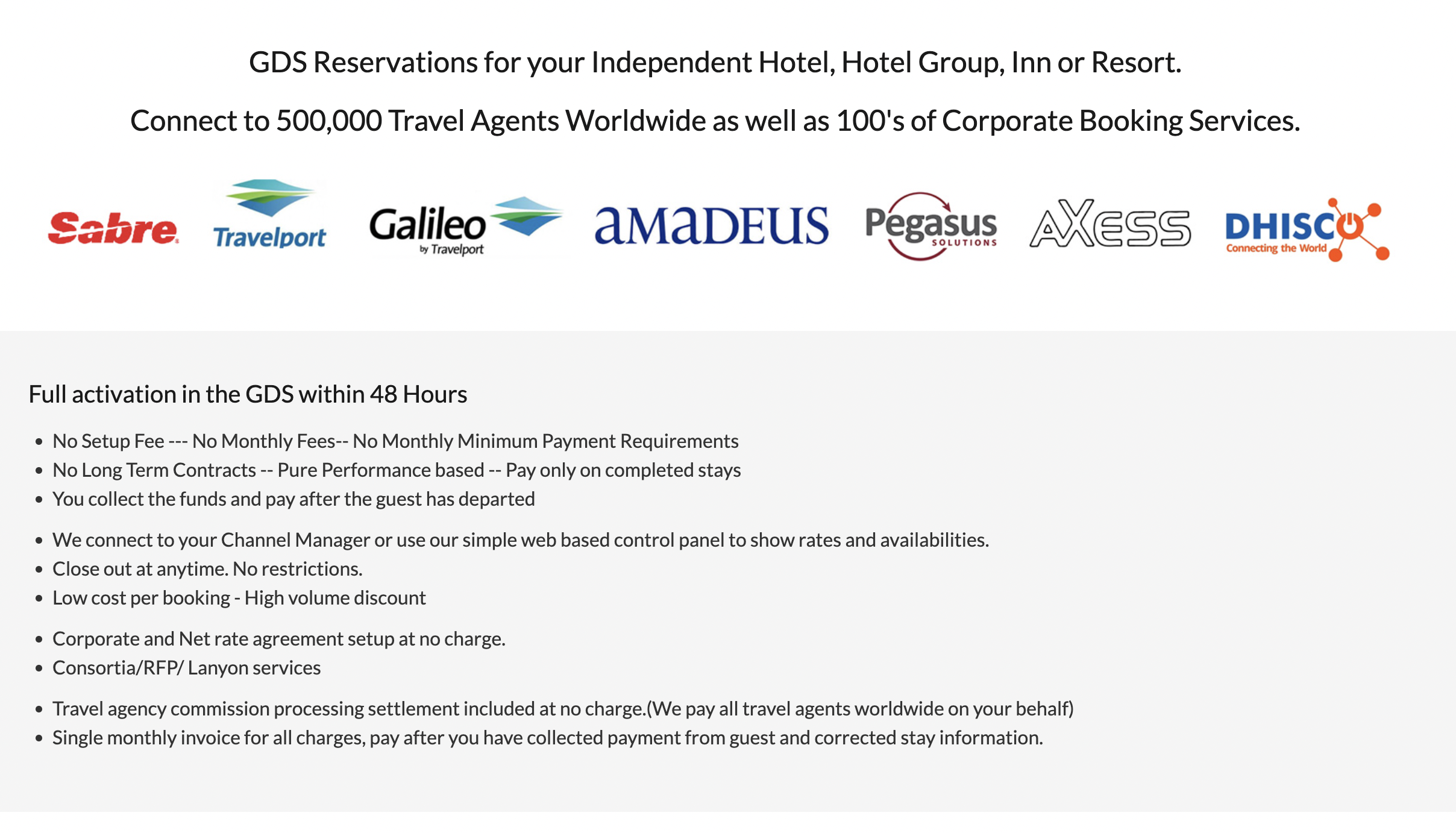 Zurich Systems is a hotel technology provider specializing in Global Distribution System (GDS) reservations and channel management solutions for independent hotels, hotel groups, inns, and resorts. Their GDS service connects properties to over 500,000 travel agents worldwide and numerous corporate booking services, facilitating broader market reach. Key features include full activation in the GDS within 48 hours, no setup fees, no monthly fees, no minimum payment requirements, and no long-term contracts. The platform operates on a performance-based model, where hotels collect funds and pay only after guest departures. Zurich Systems integrates with over 60 different channel managers and property management systems, offering a simple web-based control panel to manage rates and availability. Additional services encompass corporate and net rate agreement setups at no charge, consortia/RFP/Lanyon services, and travel agency commission processing settlements included at no extra cost.