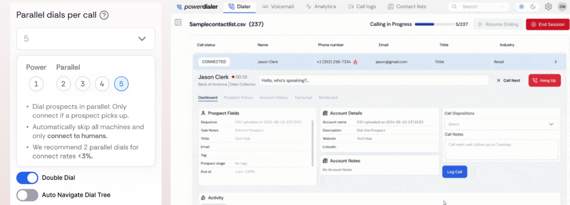 PowerDialer.ai is an AI-powered outbound sales dialer designed to enhance productivity and efficiency for B2B sales teams and agencies. The platform leverages parallel dialing, allowing users to dial multiple leads simultaneously, significantly increasing connect rates. It integrates with your CRM and uses AI to transcribe live calls, push notes, and personalize voicemails, reducing the time spent on manual tasks. With analytics, real-time insights, and integration with popular business tools like Salesforce and HubSpot, PowerDialer.ai saves sales reps up to 10 hours every week, making it easier to focus on meaningful conversations and converting leads.