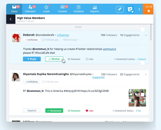 Complete community management tool for small business owners. Complete follower management on social media, easily track brand awareness, discover new leads, share quality content, schedule posts and download progress reports. Get valuable leads and start the conversation. Find new followers and build lasting relationships with potential and existing customers for your business. Find and share top curated content and tweets with your followers. Shared links display your profile and business website for them to follow. Schedule best time for posts on Twitter, Facebook and LinkedIn simultaneously. Monitor engagement rates of published posts. Get analysis of competitors and their followers, stats and influencers. All data is saved and indexed. Robust, shareable and downloadable analytics reports. Website widget report. Know when someone unfollowed you. Get suggestions on top tweeters and influencers to follow.