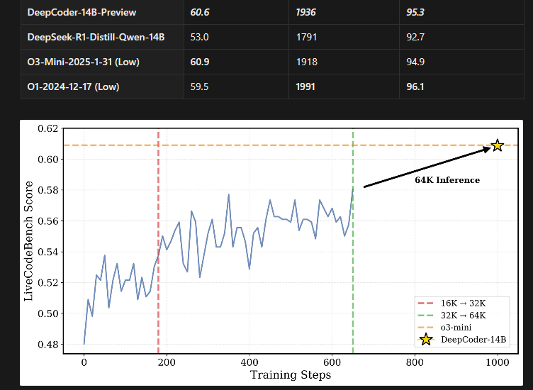 DeepCoder is a fully open source code-reasoning and generation model released by Agentica Project in collaboration with Together AI. It is fine-tuned from DeepSeek-R1-Distilled-Qwen-14B using distributed reinforcement learning, achieving a 60.6% accuracy on LiveCodeBench (representing an 8% improvement over the base), a performance level that matches that of proprietary models such as o3-mini (2025-01-031 Low) and o1 while using only 14 billion parameters. It was trained over 2.5 weeks on 32 H100 GPUs with a curated dataset of roughly 24,000 coding problems drawn from verified sources (including TACO-Verified, PrimeIntellect SYNTHETIC-1, and LiveCodeBench submissions), each problem requiring a verifiable solution and at least five unit tests to ensure reliability for RL training. To handle long-range context, DeepCoder employs techniques such as iterative context lengthening and overlong filtering.