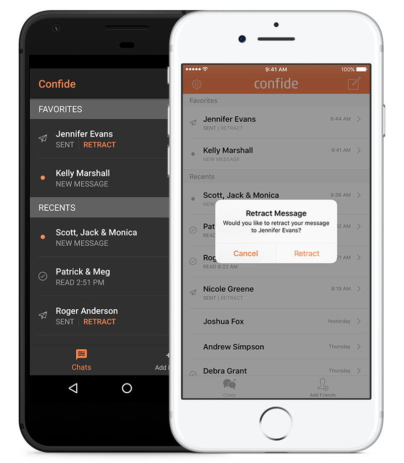 Confide uses industry-standard end-to-end encryption to keep your messages safe and to ensure they can only be read by the intended recipients. Messages disappear forever after they are read once, making them as private and secure as the spoken word. Confide’s patented ScreenShield technology keeps your communication safe by preventing screenshots of your messages. Confide utilizes industry-standard cryptography to keep your messages safe and secure. We combine this with a simple and intuitive user experience to provide superior security, with no configuration required. All messages between Confide users are end-to-end encrypted. Encryption keys are generated locally on each device and the private key never leaves the device, ensuring that only the intended recipients can read your messages. All communication goes through Transport Layer Security (TLS), preventing any possible man-in-the-middle attack and providing yet another layer of security, privacy, and data integrity.