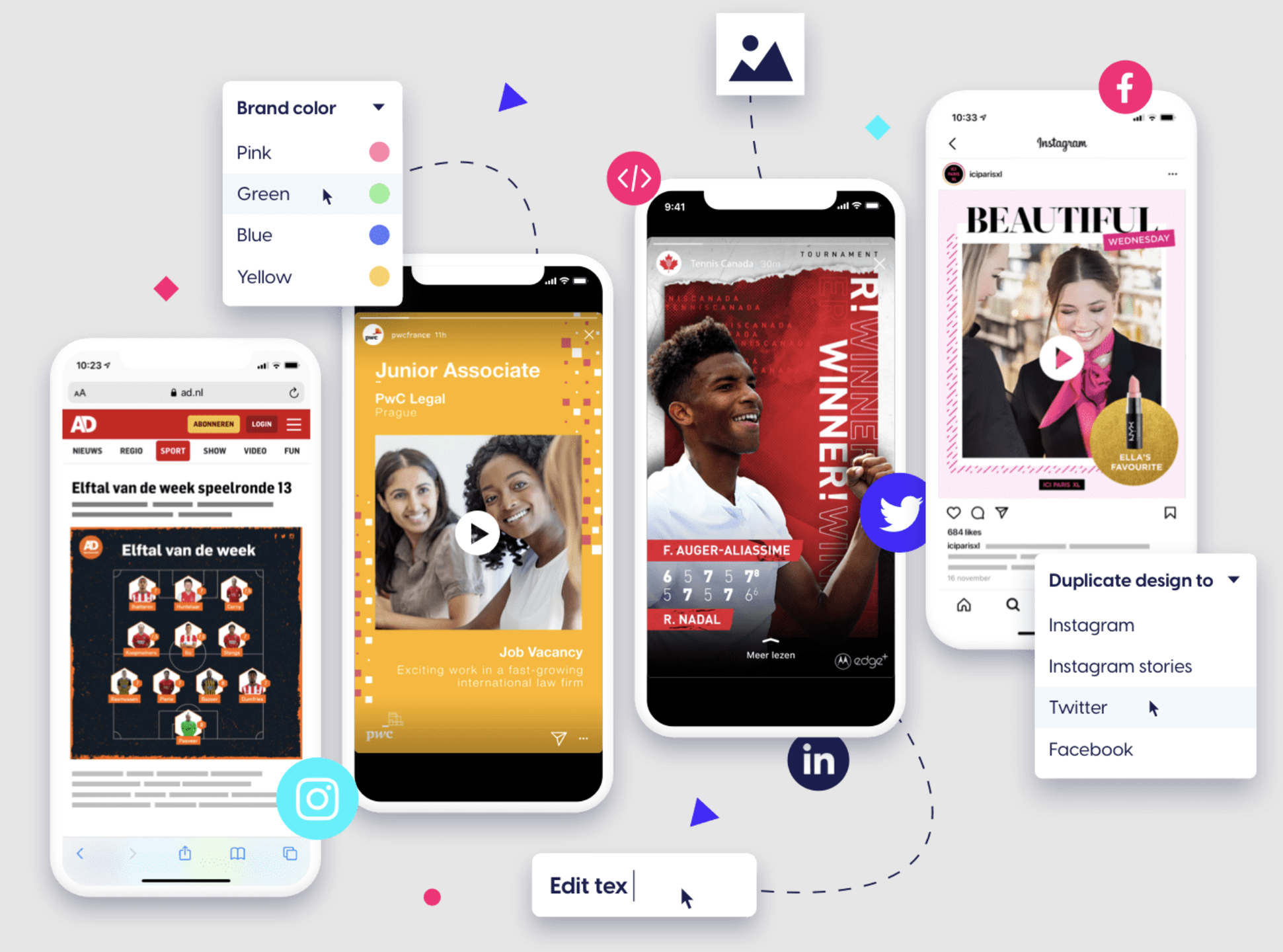 We design and build your branded templates. You create striking on-brand content faster. Content Stadium is not just an online content creation tool. It’s a tool backed by a team of design, content and social media experts. We take the lead, draw up proposals, and drive your project forward. Minimizing your time commitment. Armed with your brand guidelines and content strategy, our designers create your branded templates. Do you only have a basic brand style? Or do you already know exactly what you want? We can work with as much or as little input as you can provide. Once we’ve got every detail right and you’ve approved your designs, we define your template functionalities over an hour-long meeting. You choose how flexible or restricted, static or animated, multi-sized or multi-media they should be. Our developers build your smart branded templates with all requested functionalities in our super-intuitive Content Stadium tool.