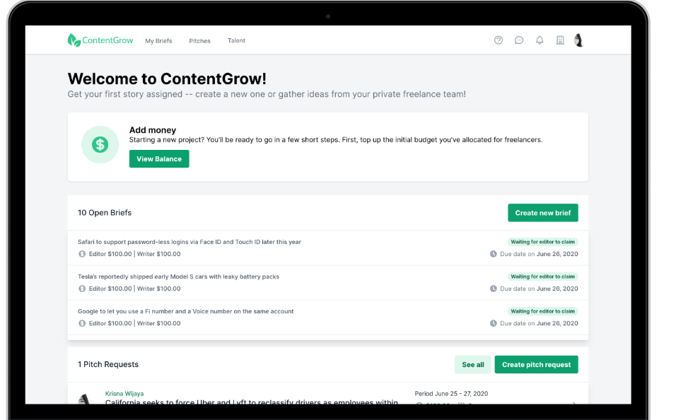 Go asset-light and add rocket fuel to your content operation. Build and scale your media powerhouse today! Commission winning pitches that become full-fledged stories. Get a free shortlist of project-appropriate content talent anywhere in the world. Receive a weekly drip-feed of relevant story ideas, exclusive to your project. Send out a call for creative story ideas on a specific topic to a private team of freelance content professionals. Implement quality control guardrails to ensure all final work is clean and on-point. Reduce repetitive comms. Click one button and watch the stories roll in! Click another to settle payments. Let contributors handle the heavy creative lifting, so you can stay light-footed, and focus on the business. Manage your team and get superior content from a custom talent pool. Orchestrate contributors by keeping them on-brief, ahead of deadline, in the know, and at your fingertips.
