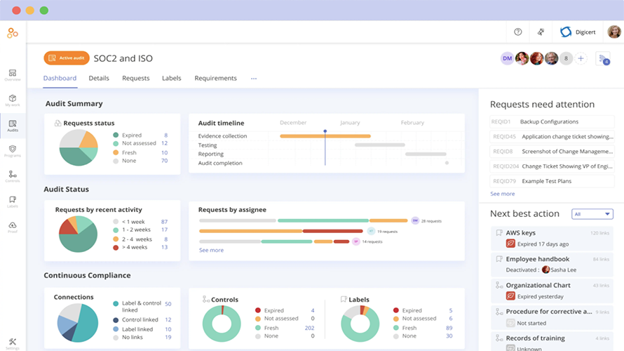 Hyperproof makes building out and managing your information security frameworks easy by automating repetitive compliance operation tasks so your team can focus on the bigger things. The Hyperproof solution also offers powerful collaboration features that make it easy for your team to coordinate efforts, collect evidence, and work directly with auditors in a single interface. Gone are the days of uncertainty around audit preparation and compliance management process. With Hyperproof you get a holistic view of your compliance programs with progress tracking, program health monitoring, and risk management.