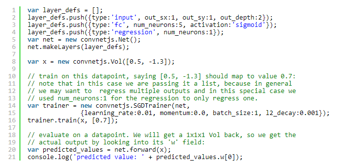 ConvNetJS is a Javascript library for training deep learning models (neural networks) entirely in your browser. Open a tab and you're training. No software requirements, no compilers, no installations, no GPUs, no sweat. The library allows you to formulate and solve neural networks in Javascript, and was originally written by @karpathy. However, the library has since been extended by contributions from the community and more are warmly welcome. The fastest way to obtain the library in a plug-and-play way if you don't care about developing is through this link to convnet-min.js, which contains the minified library. Alternatively, you can also choose to download the latest release of the library from Github. The file you are probably most interested in is build/convnet-min.js, which contains the entire library. To use it, create a bare-bones index.html file in some folder and copy build/convnet-min.js to the same folder.