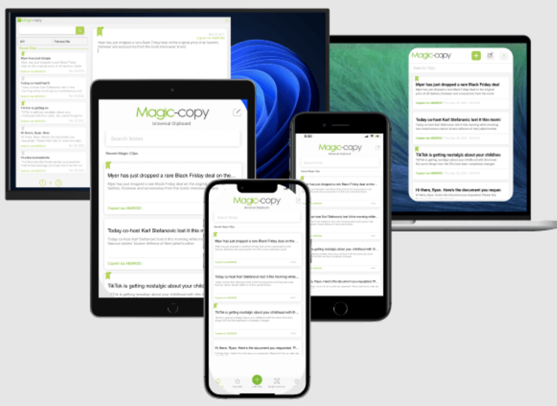 Magic Copy makes it easy for you to manage all your favorite text and links and share them across any of your devices or online. You can find Magic Copy on all the popular platforms like iOS, Android, Windows, OSX, Web and soon to be launched - Linux! You can choose how you want your data to be synced. It can sync it automatically or wait for your command. Comes with a simple note taking feature that works in realtime as well. Point your camera at anything with text on it and Magic Copy will read it and save it as a note. Your last copied text on your device will be available to be shared. When you open Magic Copy on another device, the copied data will be waiting for you there. Point your camera at anything with text on it and Magic Copy will grab the text from it. Access your most important or frequently used clips separately. You can organize your clipboard with different categories and lists.