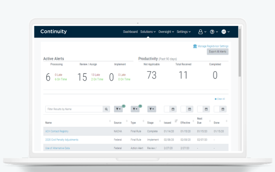 AI-driven technology enables financial institutions to fully automate their risk and compliance processes. Continuity is a RegTech solution that automates risk, compliance, vendor and performance management for the financial services industry. It integrates the mandated processes of risk and compliance to boost performance. By combining regulatory expertise with cloud technology, Continuity reduces your regulatory burden and mitigates risk at a fraction of the cost. Hundreds of financial institutions across the United States benefit from our solution. Continuity’s enterprise risk management (ERM) technology, compliance, vendor, and performance management systems are tailored to meet the specific needs of banks, credit unions, mortgage companies and financial technology firms of all sizes. A robust platform that’s built for flexibility and efficiency.