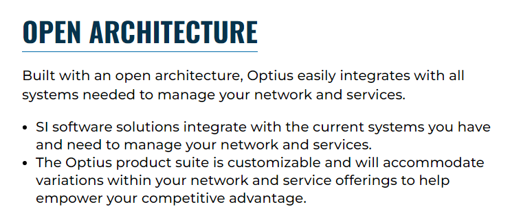 Optius Digital OSS provides pre-integrated modules for Service Order, Service/Resource Activation, Provisioning, and Inventory Management for fiber, copper, wireless and hybrid networks. Its intelligent assignment and order orchestration ensure services are activated right the first time. Optius is a modern solution designed and engineered by a leading-edge CSP with real-world operational experience. It provides one consolidated system that includes both software and services; centralizing data, processes, reporting, configuration, integration, testing, training, and maintenance all from one service provider. Optius integrates with Customer Relationship Management (CRM), Billing, and WorkForce Management (WFM) systems. Optius provides a consolidated solution to digitally transform your business, whether we provide you with partnered solutions for BSS, or we integrate with your current BSS systems.