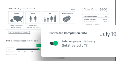 Get survey responses from around the world in minutes. Easily find your ideal respondents for market research with SurveyMonkey Audience. A quick poll? In-depth market research? Here’s how to survey your target market with SurveyMonkey Audience. Add screening questions to your survey so you reach the right people. Or choose the demographics that matter to you: age, gender, job function, region, and more. Use our survey templates or easily create your own to measure brand health, track market trends, understand consumer behavior—whatever your business cares about. Collect feedback and get real-time results. Use our analysis tools including custom reporting, filters and cross-tabbing to get insights that drive better decisions. Select respondents from our proprietary panel or tap into panels from our partners who hold the highest standards.