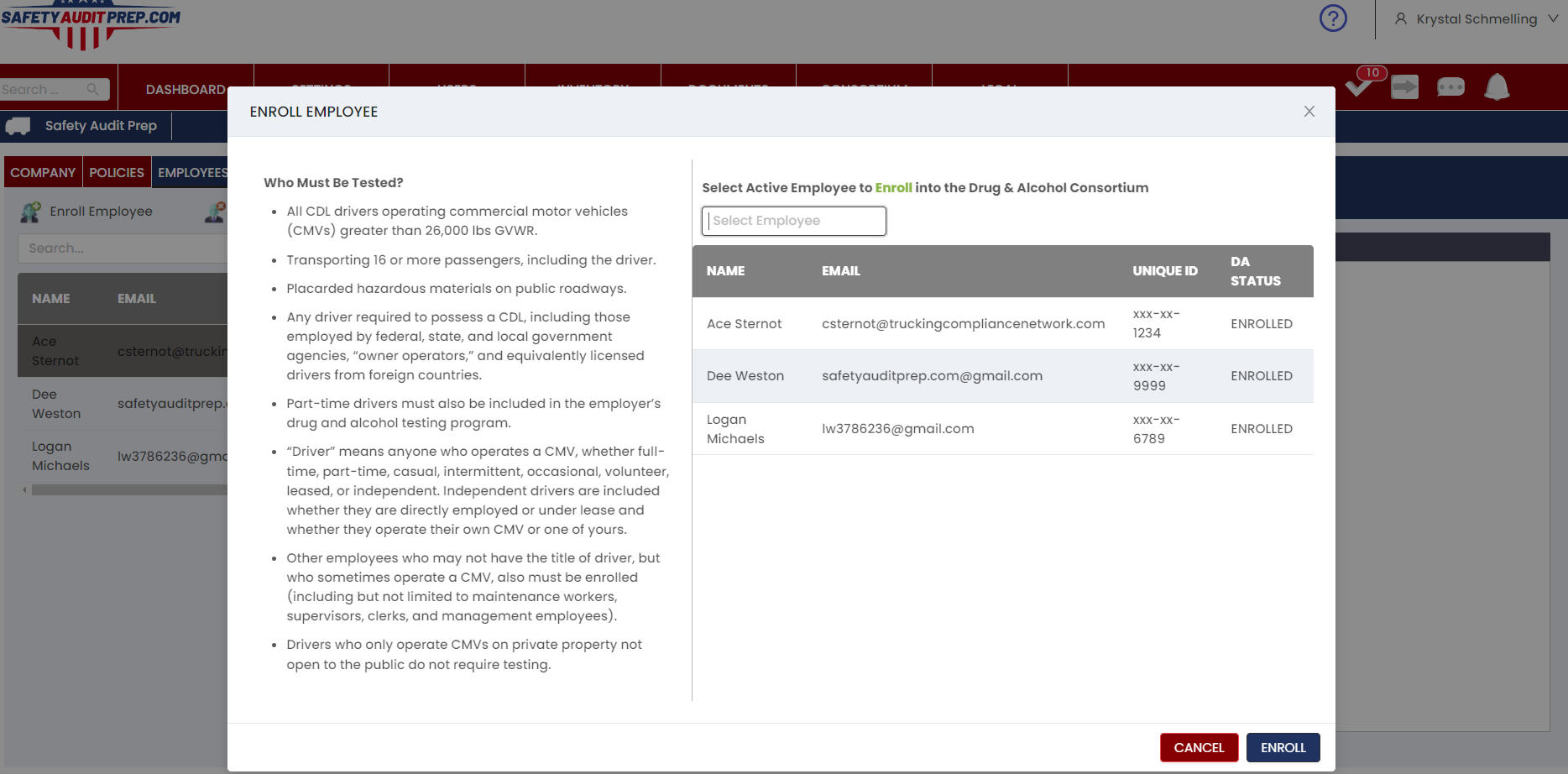 Safetyauditprep.com is a DOT compliance software that uses artificial intelligence and direct integration to make complex tasks simple. Once your company and employee information are added to the profile, the included electronic driver qualification documents are pre-filled to save your driver time. Our automated notification system will ensure you never miss a filing or annual document requirement. Enroll in our National Drug and Alcohol Testing Consortium for $5 a month per driver (large fleet prices may vary). Experience simplicity with instant Electronic Federal Chain of Custody Forms (eCCF) for DOT drug and alcohol testing, a USDOT-compliant customized Workplace DOT Drug and Alcohol Testing ePolicy. Our partnership with Quest Diagnostics provides you access to thousands of Quest, in-network and non-preferred testing locations across the United States. Upload employee and company specific documents, order MVR and PSP reports, file UCR, BOC-3 and much more.
