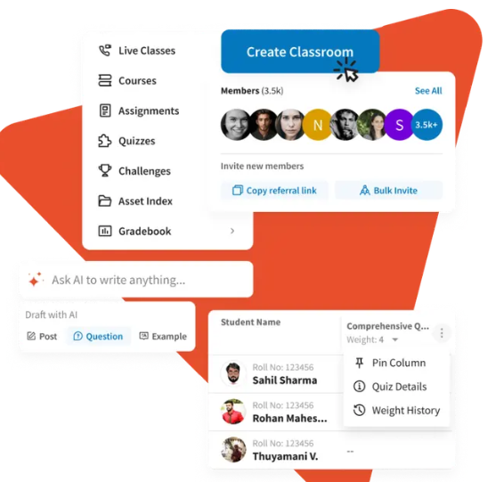 It enhances the learning experience and hence the outcome. An all-inclusive, assimilated & engaging platform to stimulate learning. Create a private space for your organization. Customize the appearance, manage memberships & classrooms, and control your growth. Let AI create/manage interactive videos, and create and evaluate quizzes faster making you 4x more efficient. Create super interactive courses and reward certificates for participation or completion. Create AI-driven advanced quizzes with easy customizations and the ability to run offline. Create AI-driven advanced quizzes with easy customizations and the ability to run offline. Offer an exhaustive report to your learners. Build an individuality for your organization, by dedicating a section for its classrooms. Detailed analytics for deep insight into user engagement. Helps you find what’s working and what needs your attention.