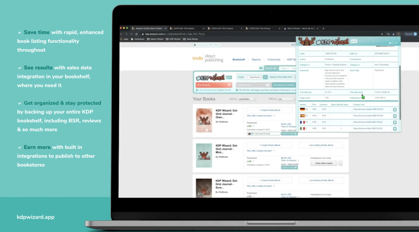 KDP Wizard lets you integrate your Kindle Direct Publishing (KDP) product data with Airtable. See real-time sales data at a glance, get an in-depth view of your sales and reviews across multiple marketplaces, and effortlessly publish new books across multiple platforms.