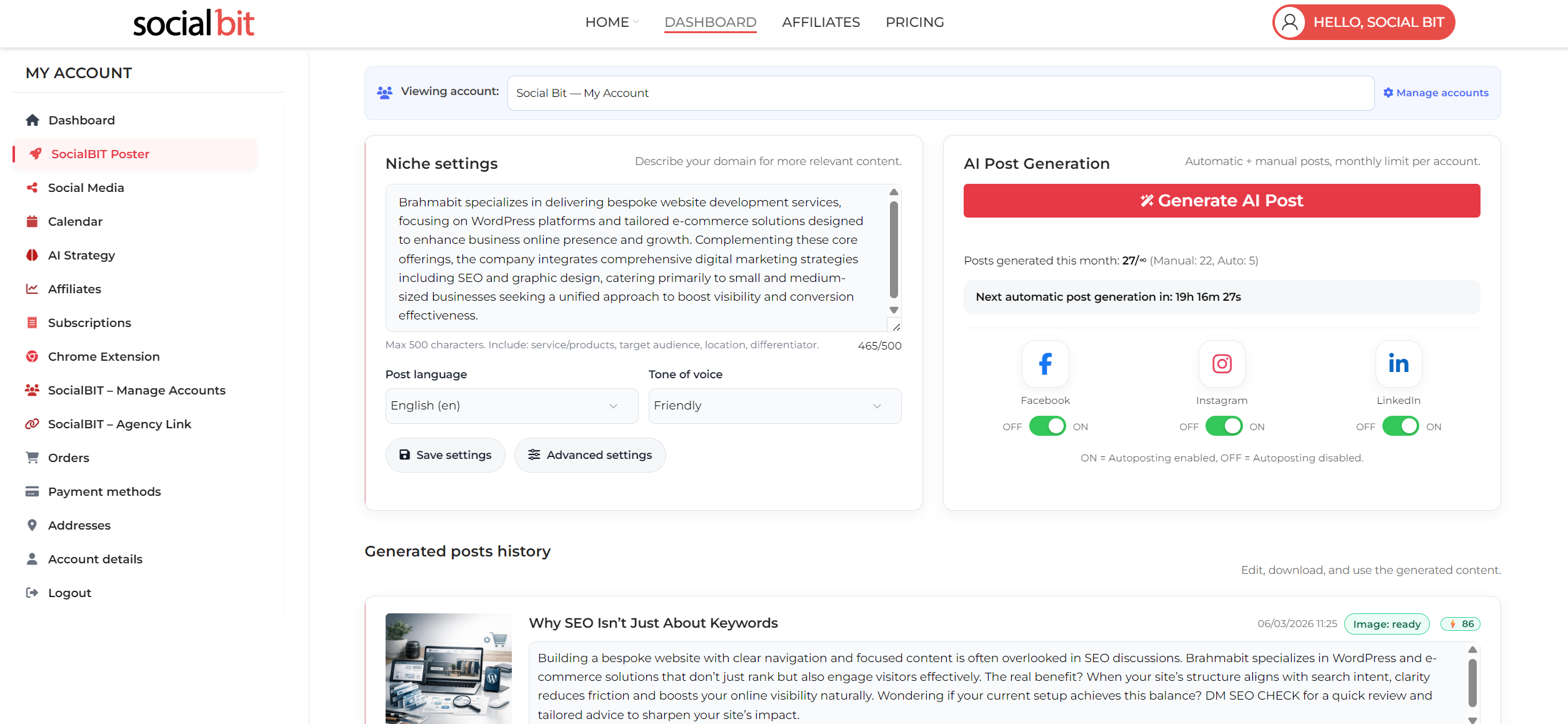 The platform enables users to automatically generate, schedule, and publish content across major social networks such as Facebook, Instagram, and LinkedIn. With built-in AI-powered content creation, SocialBIT produces optimized posts, captions, and hashtags tailored to each platform and audience.