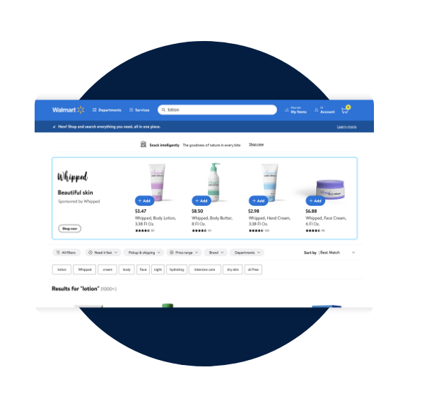 Accelerate your growth by advertising with America’s largest omnichannel retailer. At Walmart Connect we are relentlessly focused on helping brands solve their biggest marketing challenges through customer-centric solutions. We put Walmart’s scale, reach, and proprietary customer data to work for advertisers of all sizes. With access to our closed-loop measurement, you can track your campaign’s impact on sales across Walmart’s site and app, in our stores, and, for some campaigns, in the rest of the market. Whatever your goals, whether you’re a Marketplace seller or a global brand, we can help you discover new ways to connect with and engage Walmart customers. Help Walmart customers find your products as they search and browse our site and app. Static and video ads appear in prominent, high-traffic placements in search results and/or on browse, category, item, and pre-checkout pages.