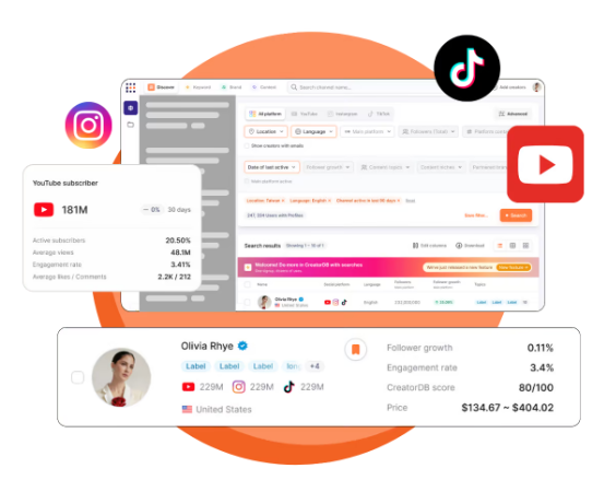 We empower brands to find the perfect influencers effortlessly using our advanced discovery tool. By combining high-level insights with contextualized metrics, our platform enables intuitive decision-making for effective and efficient influencer marketing. CreatorDB is an influencer marketing data company that harnesses its proprietary data analysis platform and global market planning capabilities to offer businesses a seamless, one-stop service from social media data analysis to complete influencer campaign management. Easily search millions of influencer profiles, growth metrics, and in-depth analytics. Experience the core power of our platform. Set your criteria and start finding the partners you need in seconds. The quickest way to understand a niche is when you are getting started. Benchmark your results with the industry standards.