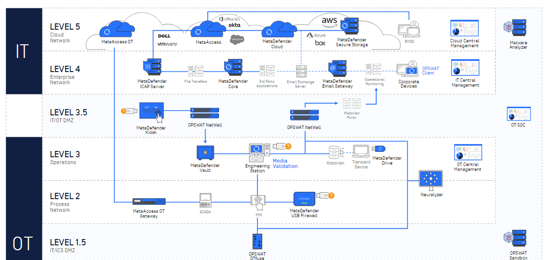 MetaDefender easily integrates with existing cybersecurity solutions at every layer of your organization’s infrastructure. With flexible deployment options purpose-built for your specific use case, MetaDefender ensures files entering, being stored on, and exiting your environment are safe—from the plant floor to the cloud. This solution uses a range of technologies to help your organization develop a comprehensive threat prevention strategy.