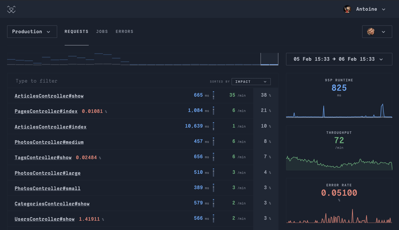 RoRvsWild is easy to use, made by and for busy Ruby on Rails developers with no time to waste on undecipherable graphs and endless settings. Measure the response time and throughput for all your requests. Find out where to focus your optimizations on, and the line in your code causing the slowing down. Supervise ActiveJob, Delayed Job, Resque, Sidekiq and cron jobs. As for requests, benchmark the slowest SQL queries and their impact on your servers. Be notified by email, Slack or Teams whenever a new kind of exception happens. Get all the information you need to eradicate the most critical bugs in your app. Grant access to all the developers in your team. Manage alerts per app. RoRvsWild supports Redis, MongoDB, Elasticsearch, and all SQL databases.