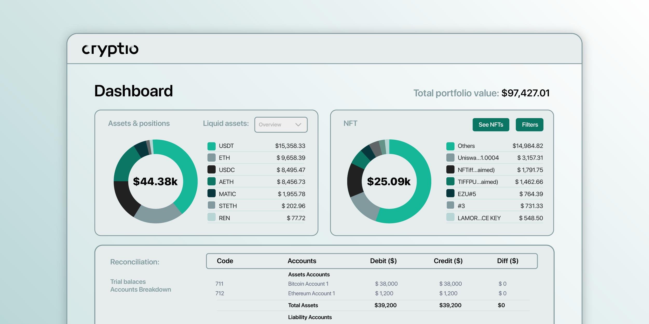 Cryptio lets you track assets & transactions from DeFi protocols, institutional custody solutions, wallets, and exchanges to construct a complete picture of your digital asset activity.
