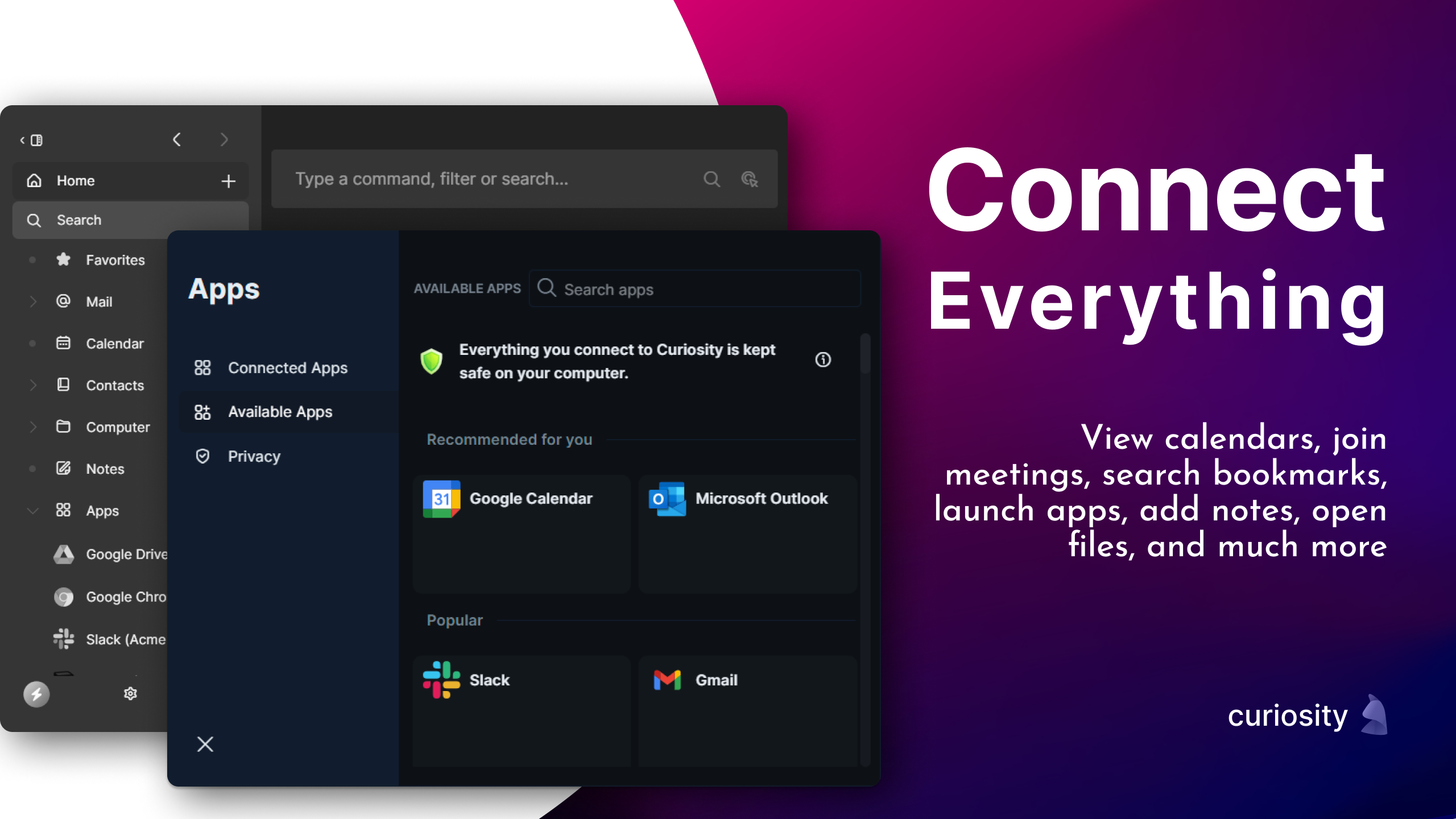 Curiosity is a powerful search app that gives you one place to find all your files, emails, and apps. It eliminates the need for multiple searches, saving you time and increasing your productivity.