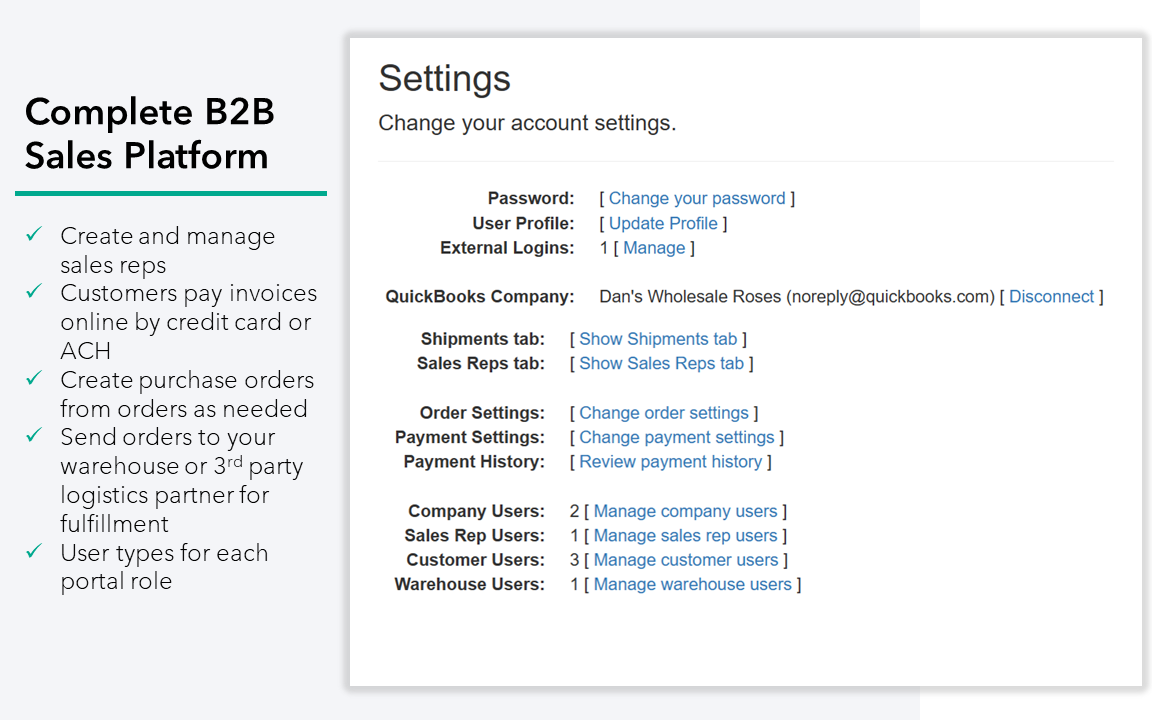 Now Commerce is a web-based B2B eCommerce portal with built-in QuickBooks integration. It allows wholesalers, manufacturers, and distributors to manage orders from their wholesale accounts and other B2B customers from a single web-based dashboard.