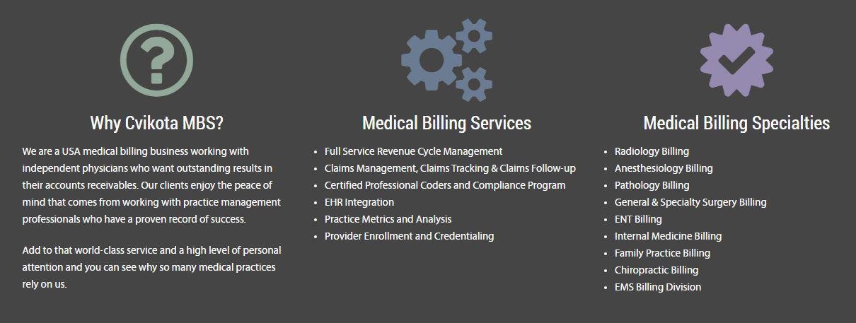 Cvikota Medical Business Services – Your partner for medical billing results. Cvikota MBS, a USA based medical billing company, has been in the business of revenue cycle management for over 50 years. Through five decades we have carefully developed our best practices in order to provide attentive, boutique-level billing services while offering outstanding value. As a proven provider of medical billing services and comprehensive practice management, we bring our unique experience and proven medical billing processes to all of our business relationships. Independent physicians, hospitals, and office based practices alike rely on us as their trusted comprehensive revenue cycle team. Can we put our practice management and medical billing expertise to work for you? We are a USA medical billing business working with independent physicians who want outstanding results in their accounts receivables.