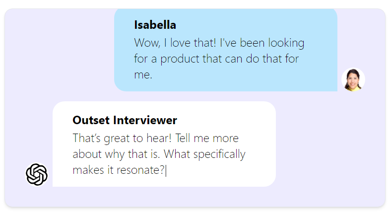Get the insights you need at the speed your business demands, with AI-moderated interviews. Conduct 1000 interviews at once, in any language. Our AI interviewer engages participants in rich discussions and probes deeper to get the ‘why’ behind answers. Throughout a research project, our AI engine analyzes transcripts for you. Get summaries, extract and count themes, and highlight powerful verbatims to tell your story. When you need answers quickly, leverage the speed and reach of an AI-moderated interview. Get hundreds of in-depth conversations in less than a day.